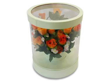 Круглая коробка из пластика с прозрачной крышкой и оклейкой дизайнерской бумагой, со стаканом и подиумом под цветы D25 см H30 см